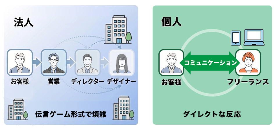 誰が担当になっても一定の品質が担保される仕組みがありますが、その分、コミュニケーションは事務的になりやすく、クライアントの細かなこだわりが制作現場に伝わりにくいという側面もあります。