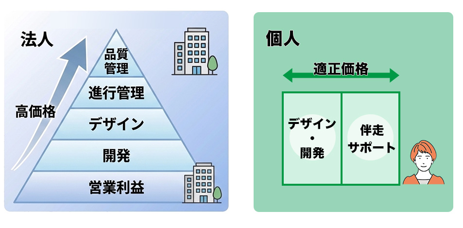 法人よりも安い理由は、オフィス代や広告宣伝費といった「固定費」が少なく、純粋な「制作工数(技術料)」のみで見積もりが構成されるからです。